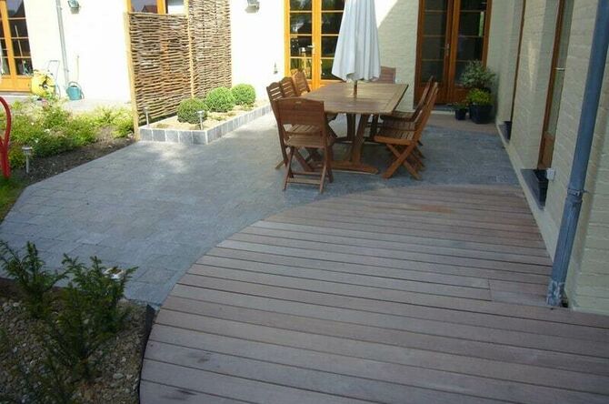 - Plaatsing van terrassen met hout, straatstenen, platen, tegels of beton